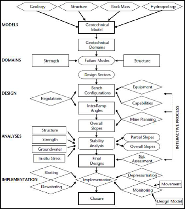 - Design factors include topography, slope geometry, pit rock mass, pit water management and pit design. Water management is important including pore pressures.