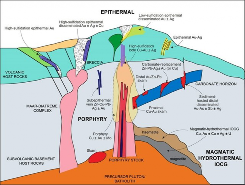 • Batu Hijau, Indonesia: Porphyry Cu–Au formed beneath volcanic cover; magmatic–hydrothermal fluids vented through volcanic structures.
