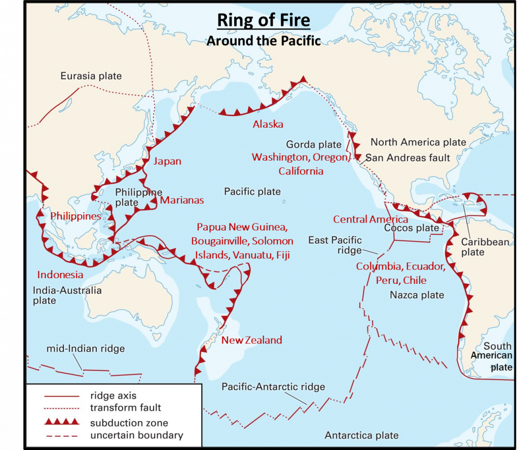 - Around the Pacific is a large scale geological feature called the “Ring of Fire”. The name comes from the number of volcanic systems ~450# around this perimeter (~75% of the Earth’s volcanoes).