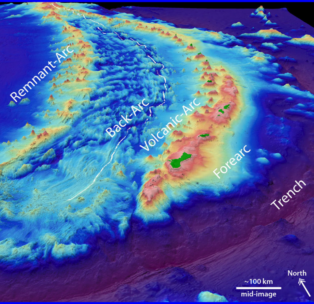 - The Marianas Islands were formed by a volcanic island arc resulting from the subduction of the Pacific Plate beneath the Mariana Plate. The classic configuration of forearc, volcanic arc, and back-arc are present as well as an older remnant arc formed as the Mariana Trough expanded. In front of the arc is the #2550km long by 69km in width Mariana Trench which is the deepest oceanic trench at ~11km deep.