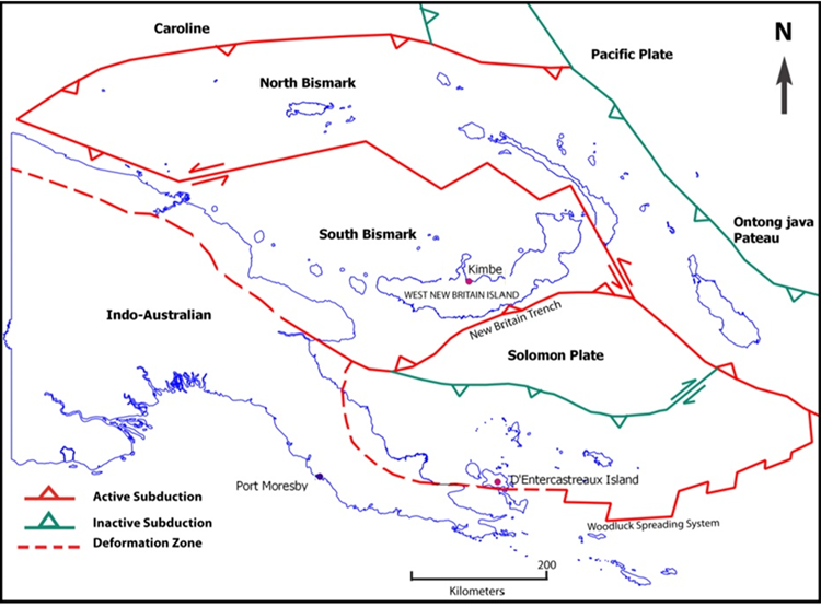 - Papua New Guinea (PNG) formed with the collision of three tectonic plates: Australia Plate moving north, Pacific Plate moving west-northwest, and the Caroline Plate moving east. A number of microplates were formed between the Australian and Pacific Plates. A series of geological terranes were formed over geological time.