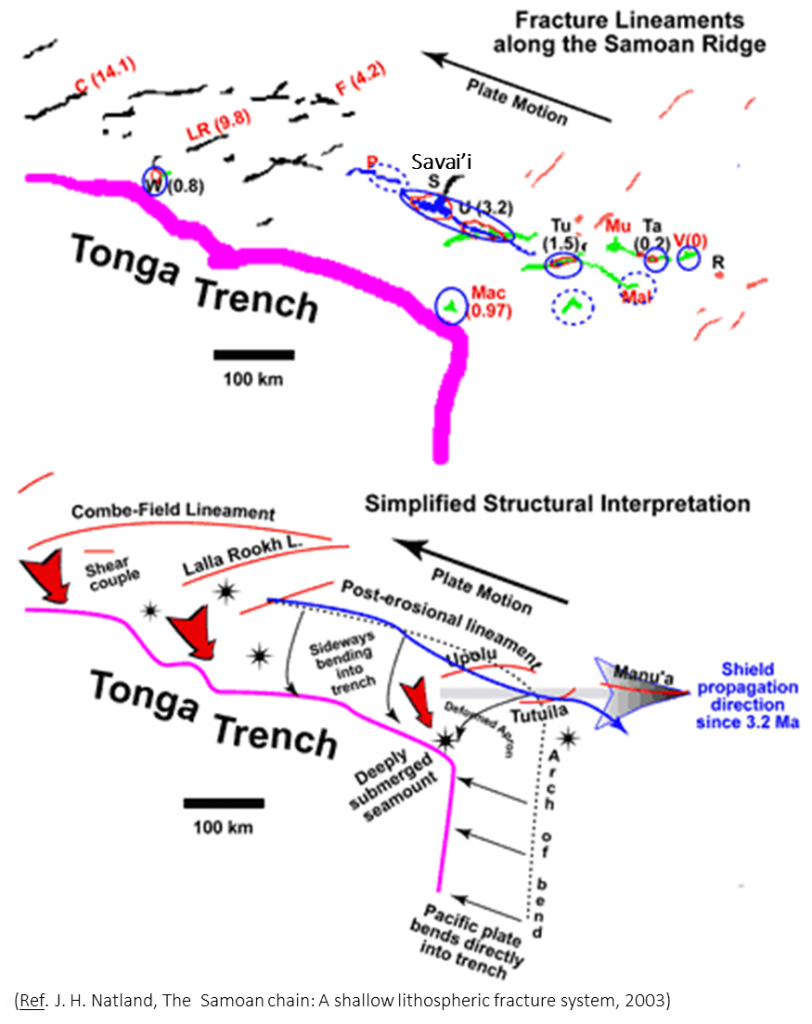 - Subsequently (millions of years later), volcanism was rejuvenated along a narrow ~200km long rift system. This volcanic rift system has been associated with juxtaposition of hot spot and trench and associated lithospheric cracking due to tectonic stresses from the trench plate flexure deformation. Different theories attribute various sources of the magmatic activity, whether associated with a plume-depleted asthenosphere (viscous “keel”) or a thermally anomalous, upwelling region of the mantle (plume) beneath Samoa.