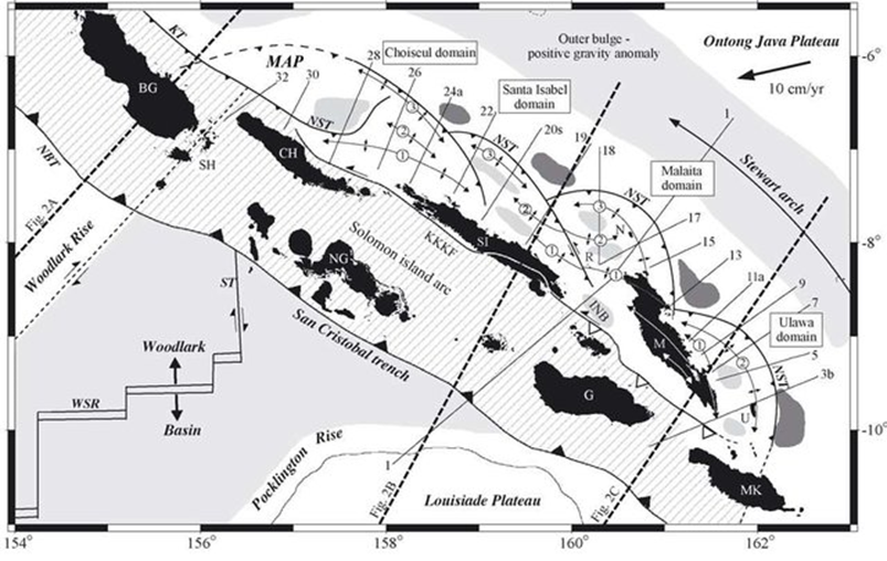 - The original and subsequent subduction systems affected where and how volcanic systems and islands developed across the Solomon Island Arc. A single linear chain of islands (Choiseul, Santa Ysabel, Guadalcanal and San Cristobal ) was separated by these events, leading to the formation of Malaita on the northside and the islands of New Georgia group on the southside – a double chain arc.