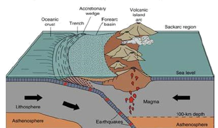 - Volcanic Geothermal Systems can involve both shallow and deep heat resources. In either case, heat rises up from the Mantle in Magmatic Conduits. For Volcanic Island Arcs as shown in the sketch at left, an oceanic tectonic plate (L) is shown subducting beneath another oceanic tectonic plate (R). As the subducting plate descends, increasing pressure and heat causes the release of water and other volatile materials that cause melting of rock and the formation of magma that rises upwards due to being buoyant (less dense than the surrounding rock). Faults and fractures help provide pathways called Magmatic Conduits as shown in the lower sketch at left.