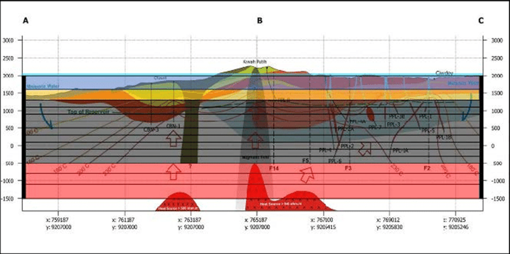 • Altar et al described the “typical lifecycle of a volcanic hosted hydrothermal system: (1) a magmatic intrusion forms at depth; (2) meteoric fluids find their way to the intrusion through fractures in the rocks and heated up; (3) a convection cell develops; and finally, (4) complex fluid-rock interactions initiate due to fluid flow and high temperatures, resulting in mineral alteration, fluid chemistry evolution and porosity and permeability changes within the host lithologies.” (https://doi.org/10.1016/j.geothermics.2024.103132)  This life cycle needs to be represented in the preparation of these models and calibrated against the measured data prior to drilling and development.