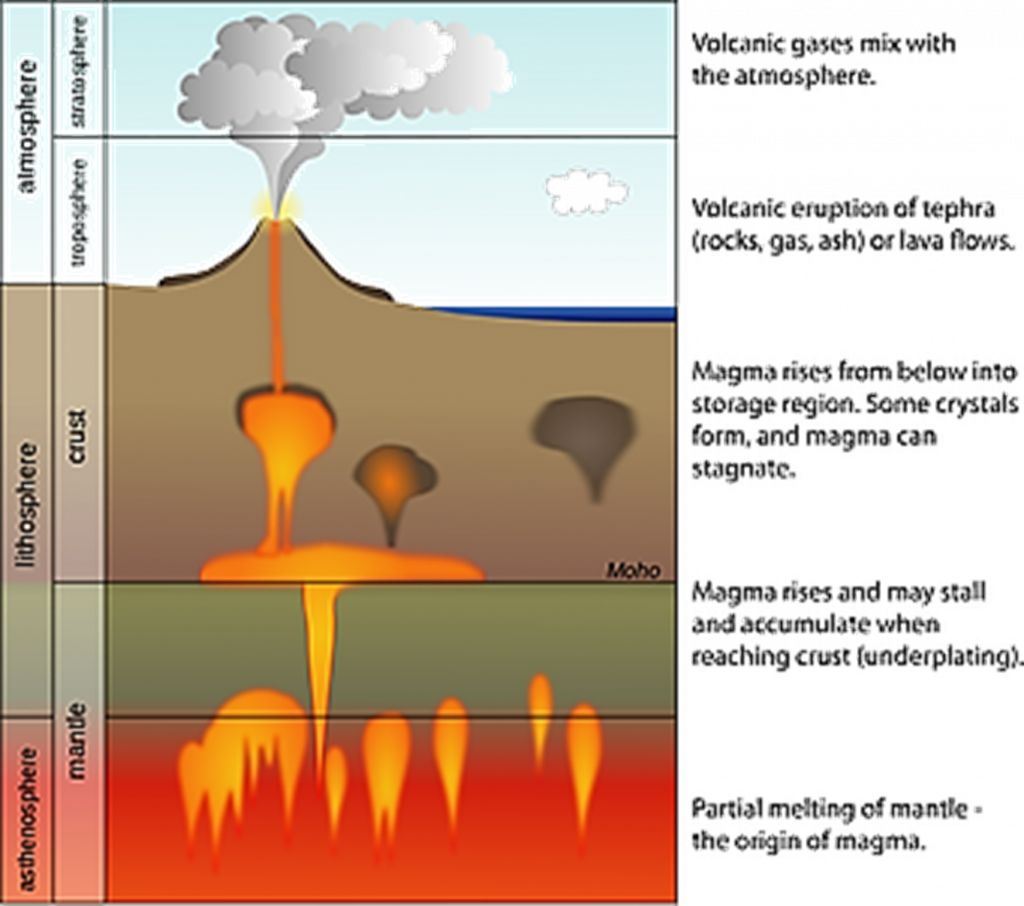 • Geological displacements and forces at these plate boundaries are demonstrated by seismic events and volcanic eruptions.  Magma is formed in the mantle by either decompression of hot, solid mantle rock or by lowering the melting temperature of this rock by the addition of volatiles (water) at these locations.  Variations in processes and rock types produce a range of magma compositions, pathways (conduits, dikes, sills), eruptive behaviour, types of volcanic products (lava, ash, pyroclastics, gases), and what happens at the surface.