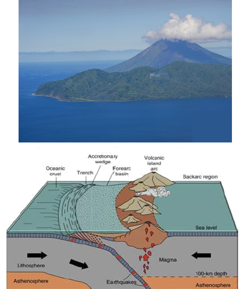 • The volcanic island’s geology often contains strike-slip and normal fault system that help provide a pathway for magmatic conduits to rise up from the subducting slab to the surface and create a stratovolcanic island.
